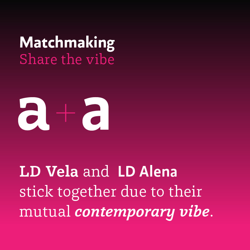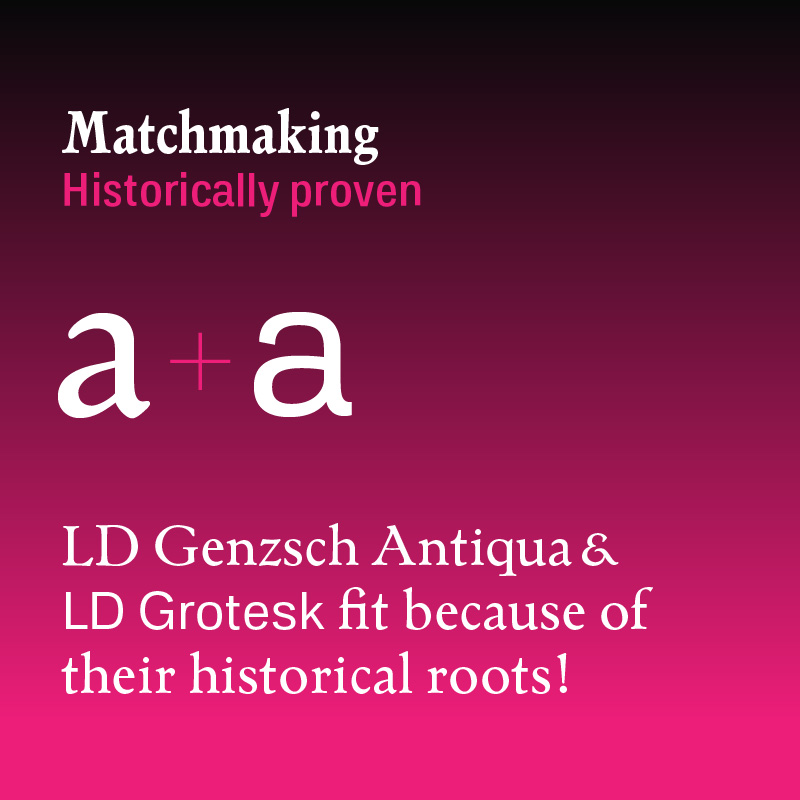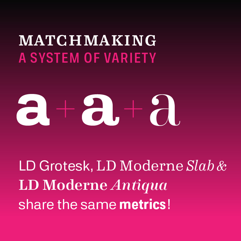 Bold, modern-style typefaces seem to be an inconsistent implementation of the classicistic letter shapes. In search for a better approach, in 2013 Kai Büschl decided to reanimate an old modern style type draft and rework it. But instead of thickening the vertical stems, he rather designed the bold weight with heavier horizontal strokes and serifs. So the shifting towards the bold weight simultaneously is a shifting towars a slab serif typeface.